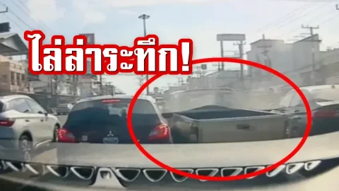 กล้องชัด! ตำรวจจราจรไล่ระทึกกระบะผัวเมียไม่ติดแผ่นป้าย ฝ่าไฟแดงชนเก๋ง - กระบะเสียหาย 3 คัน