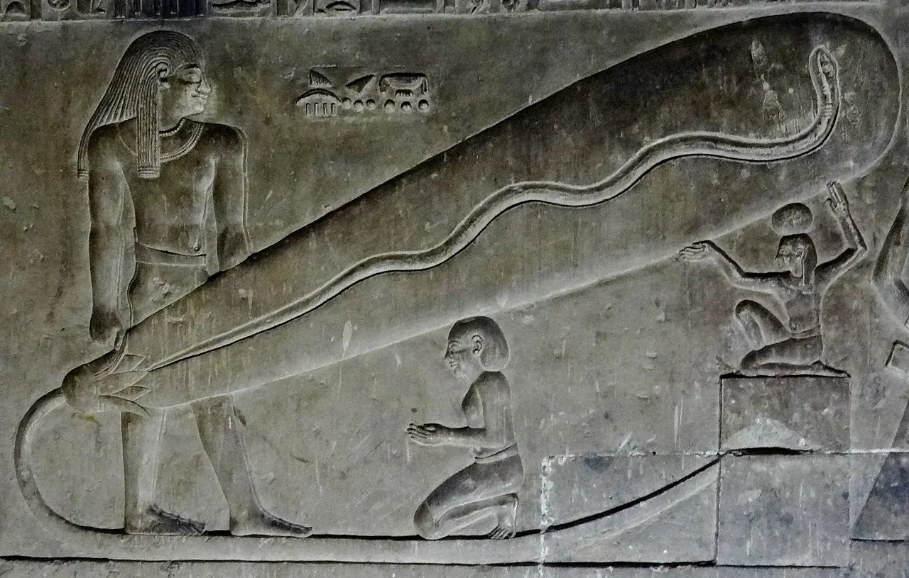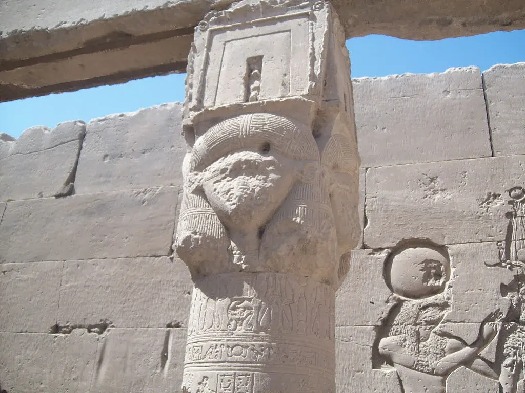 ที่ผนังวิหารมีภาพสลักของเทพ **ฮาโซมทัส (Harsomtus)** ในรูปของงูที่กำลังโผล่ออกมาจากดอกบัว ซึ่งเป็นเทพเจ้าสร้างสรรค์ในยุคแรกเริ่ม ตามตำนานเทพเจ้าฮาโซมทัสถือเป็นบุตรหรือคู่รักของเทพีฮาเธอร์
