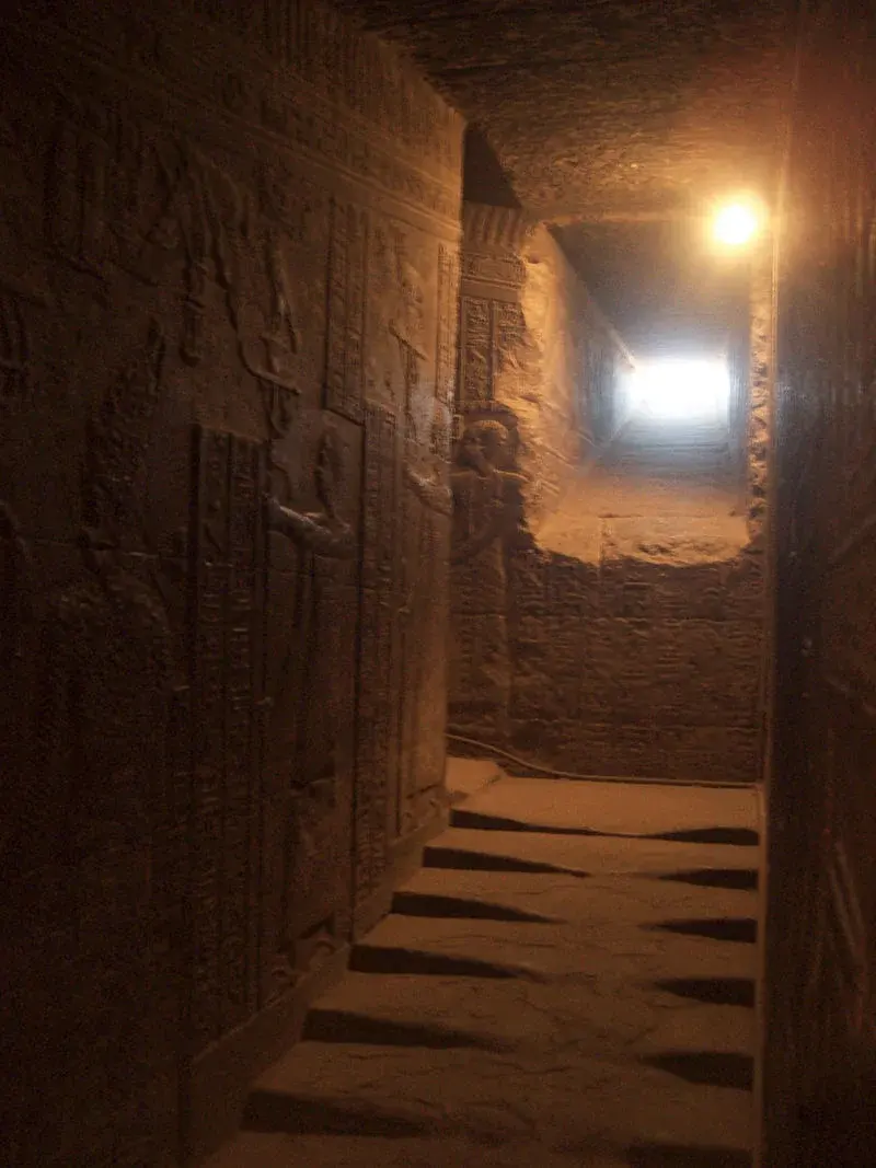 ใต้พื้นของวิหารเทพีฮาเธอร์มีห้องใต้ดิน 12 ห้อง ซึ่งบางห้องมีภาพนูนต่ำ ที่สามารถย้อนอายุได้ถึงยุคของฟาโรห์ปโตเลมีที่ 12 ออเลเตส ห้องใต้ดินเหล่านี้ เคยใช้เก็บภาชนะและสัญลักษณ์ของเทพ