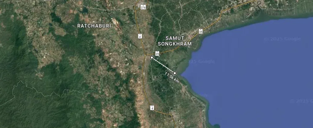 จากจุดนี้ไปจนถึงชายฝั่งทะเลอ่าวไทย มีระยะทางประมาณ 11.5 กิโลเมตร