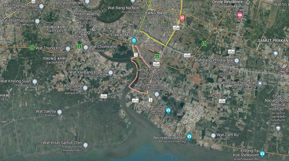 จังหวัดสมุทรปราการ มีพื้นที่ 7.332 ตารางกิโลเมตร มีระยะทาง