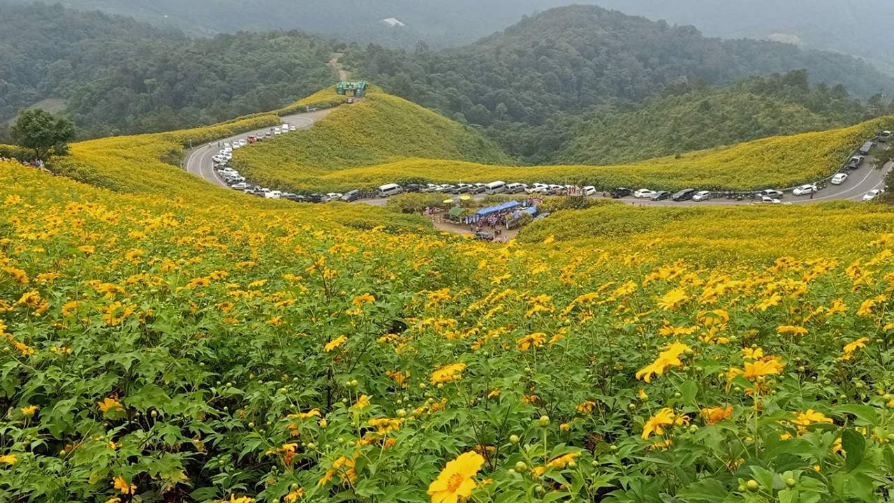 สีเหลืองสดใสบานสะพรั่งเต็มท้องทุ่งและไหล่เขา ถนนเส้นนี้