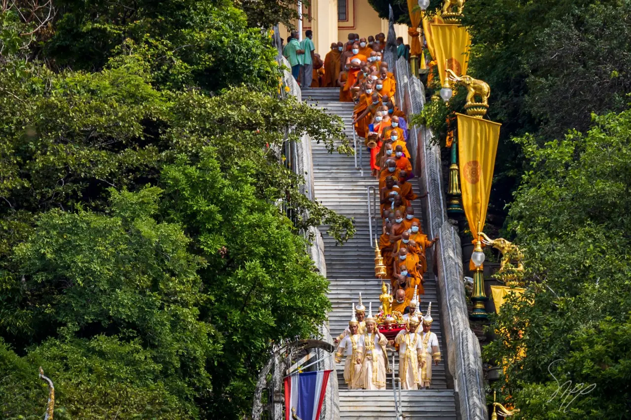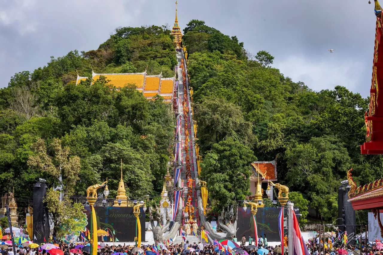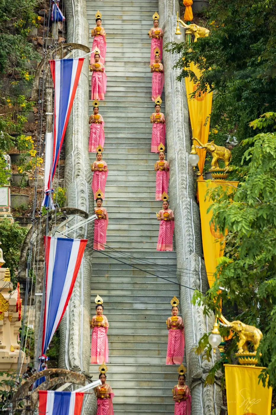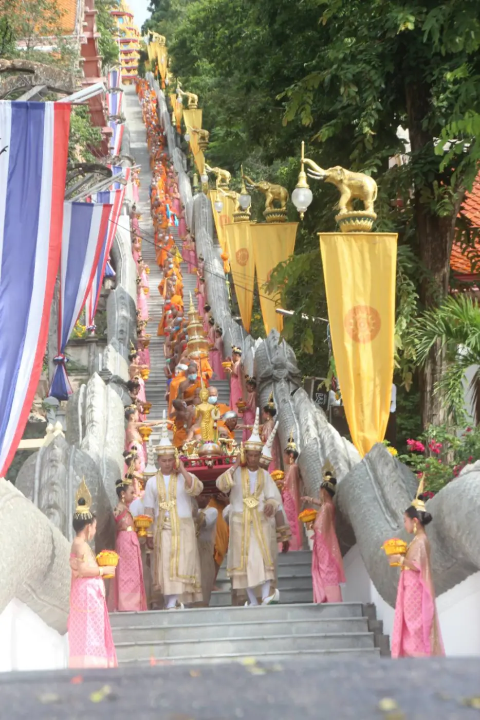 พระพุทธรูปถูกอัญเชิญลงจากมณฑปบนยอดเขาสะแกกรัง โดยมีขบวนเทวดาแต่งเต็มอลังการ แบกเกี้ยวลงมาตามบันไดพญานาคที่ทอดยาวลงมาจากยอดเขา ขนาบบันได 2 ข้างทางด้วยหญิงสาวในชุดไทยงดงาม เปรียบเสมือนนางฟ้าจากสวรรค์มาส่งเสด็จพระพุทธเจ้า ภาพตรงหน้ามันเหมือนพาย้อนเวลากลับไปยังวันที่พระพุทธองค์เสด็จลงจากดาวดึงส์จริงๆ เลยทุกคน