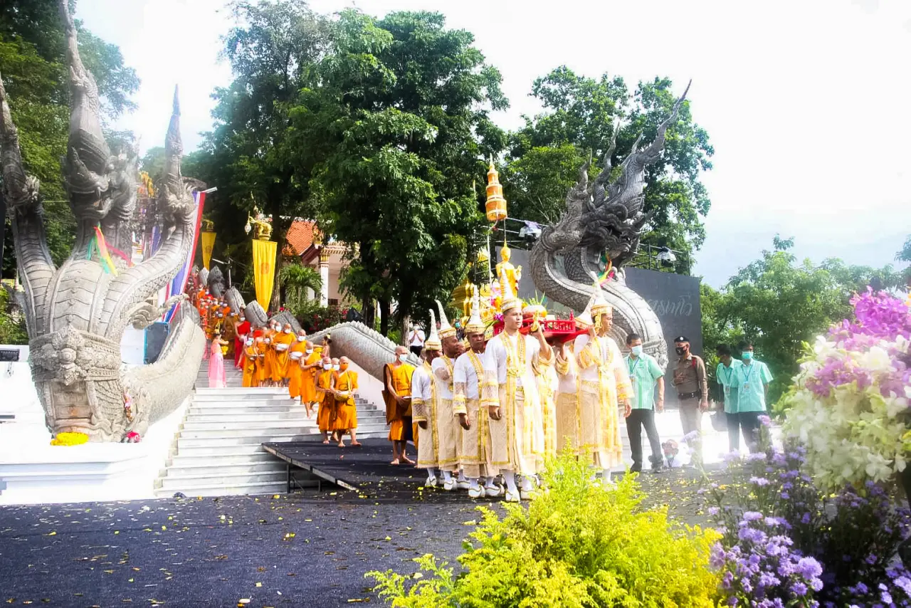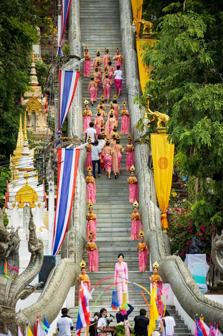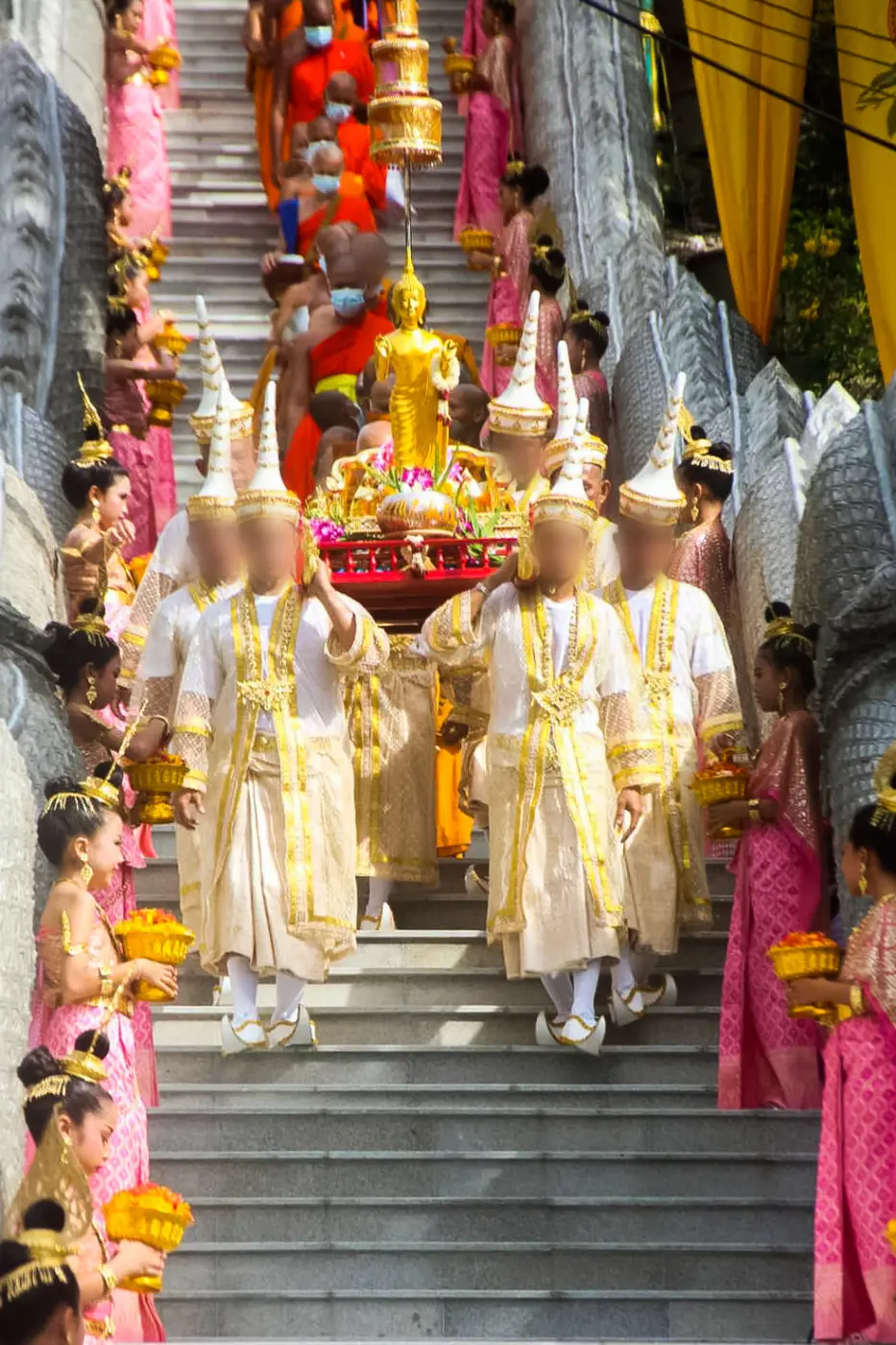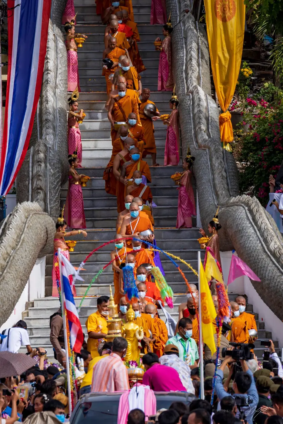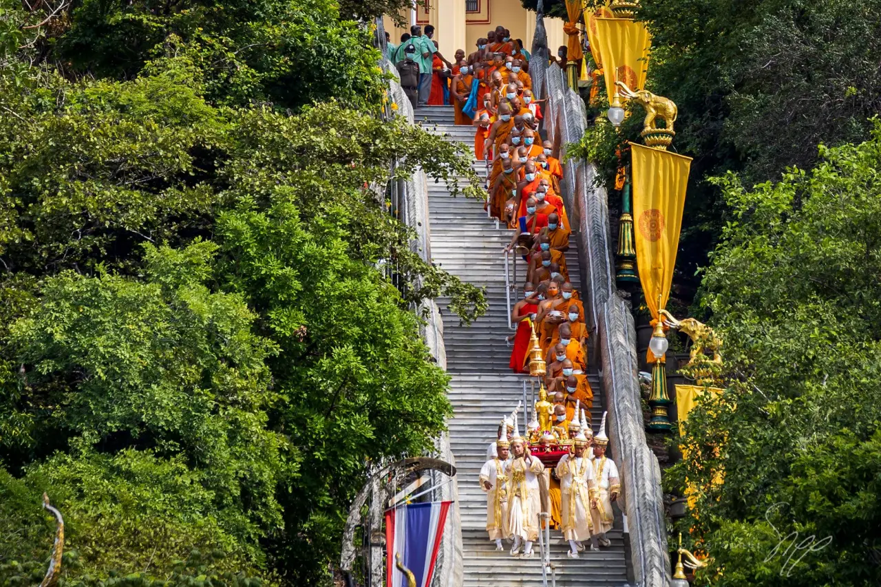 พระพุทธรูปถูกอัญเชิญลงจากมณฑปบนยอดเขาสะแกกรัง โดยมีขบวนเทวดาแต่งเต็มอลังการ แบกเกี้ยวลงมาตามบันไดพญานาคที่ทอดยาวลงมาจากยอดเขา ขนาบบันได 2 ข้างทางด้วยหญิงสาวในชุดไทยงดงาม เปรียบเสมือนนางฟ้าจากสวรรค์มาส่งเสด็จพระพุทธเจ้า ภาพตรงหน้ามันเหมือนพาย้อนเวลากลับไปยังวันที่พระพุทธองค์เสด็จลงจากดาวดึงส์จริงๆ เลยทุกคน