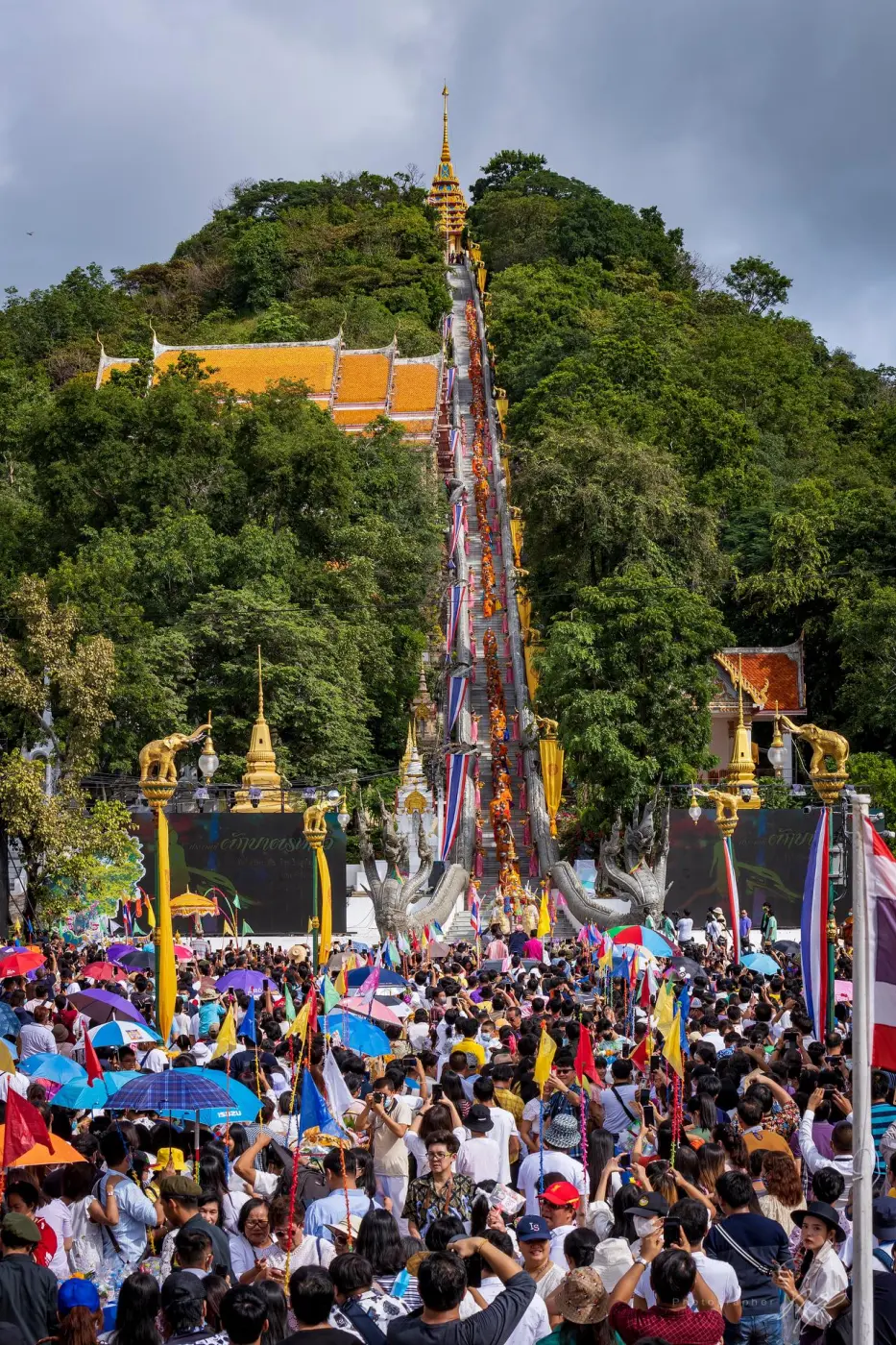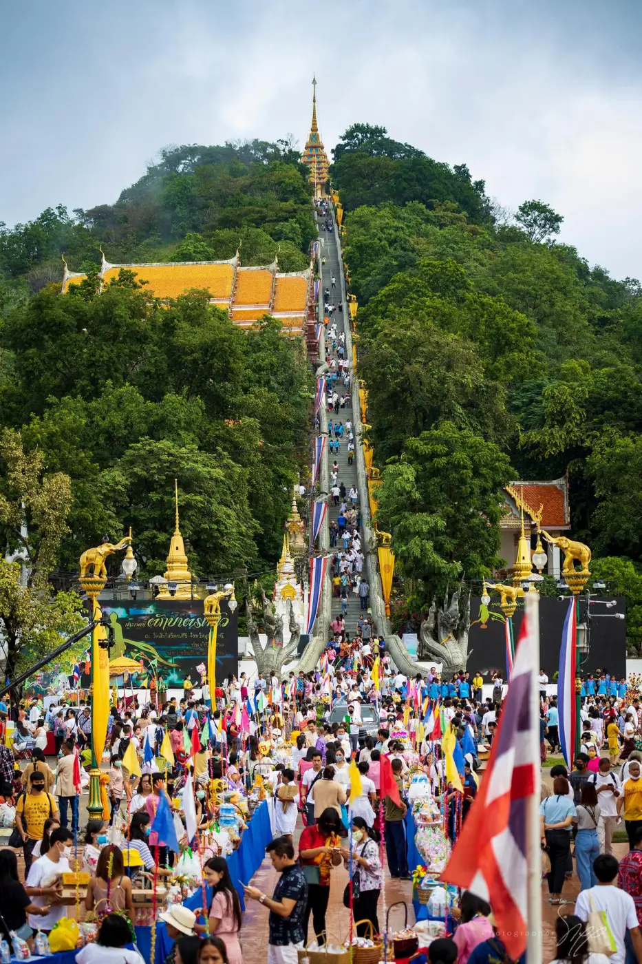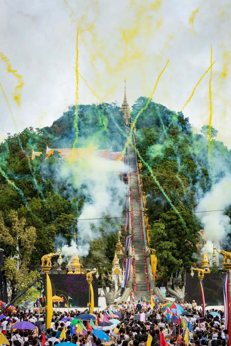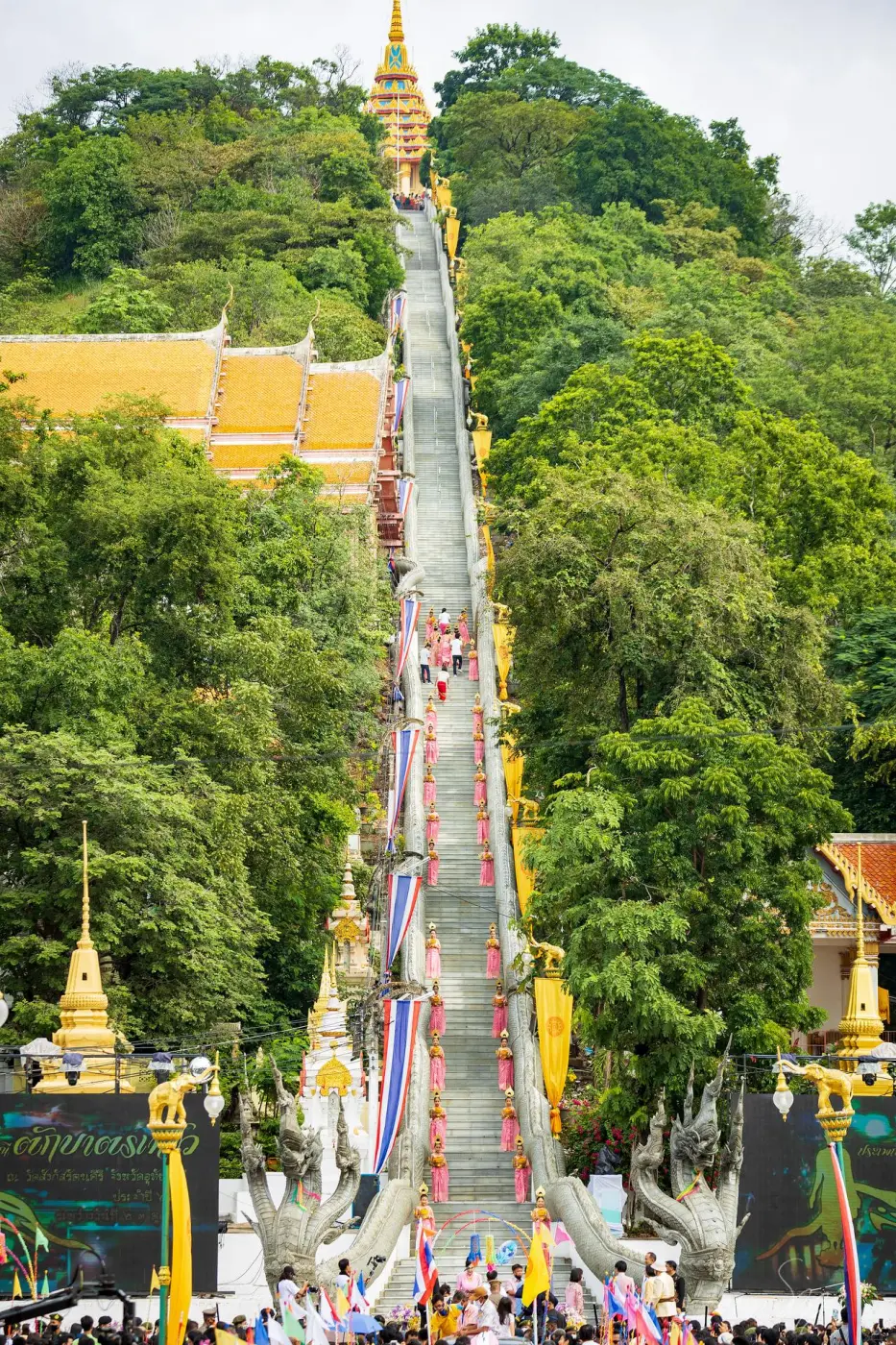 พระพุทธรูปถูกอัญเชิญลงจากมณฑปบนยอดเขาสะแกกรัง โดยมีขบวนเทวดาแต่งเต็มอลังการ แบกเกี้ยวลงมาตามบันไดพญานาคที่ทอดยาวลงมาจากยอดเขา ขนาบบันได 2 ข้างทางด้วยหญิงสาวในชุดไทยงดงาม เปรียบเสมือนนางฟ้าจากสวรรค์มาส่งเสด็จพระพุทธเจ้า ภาพตรงหน้ามันเหมือนพาย้อนเวลากลับไปยังวันที่พระพุทธองค์เสด็จลงจากดาวดึงส์จริงๆ เลยทุกคน
