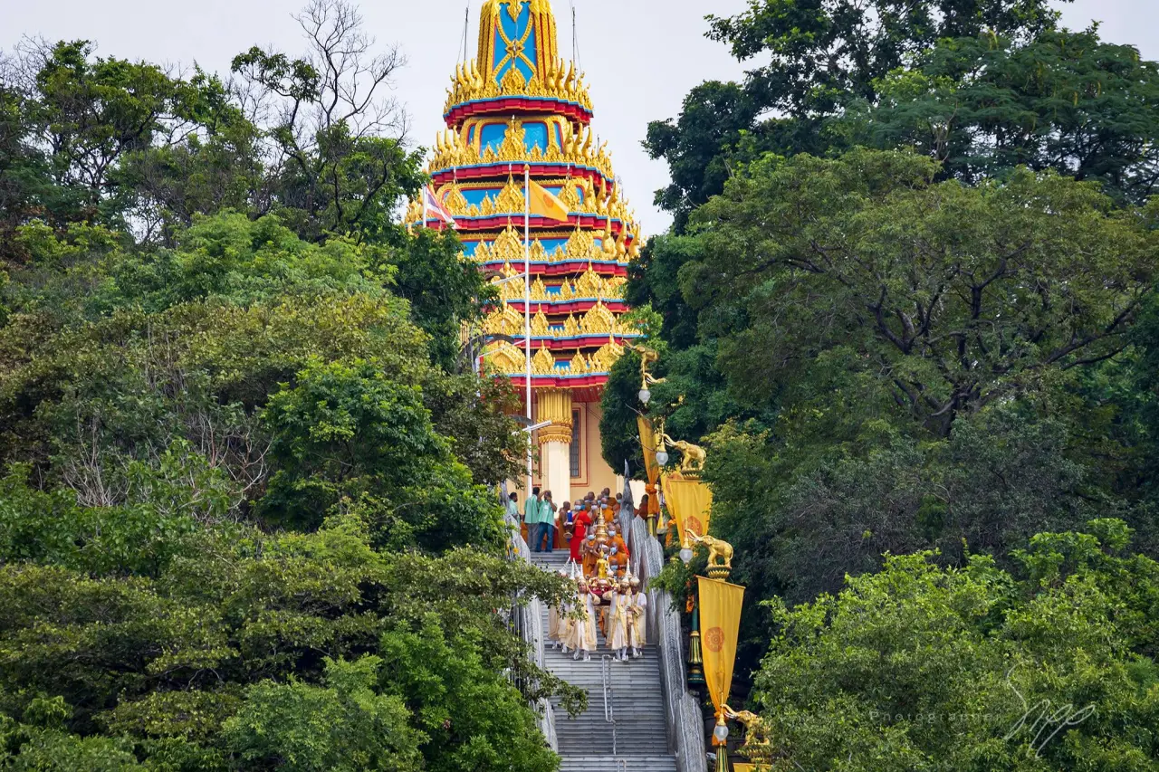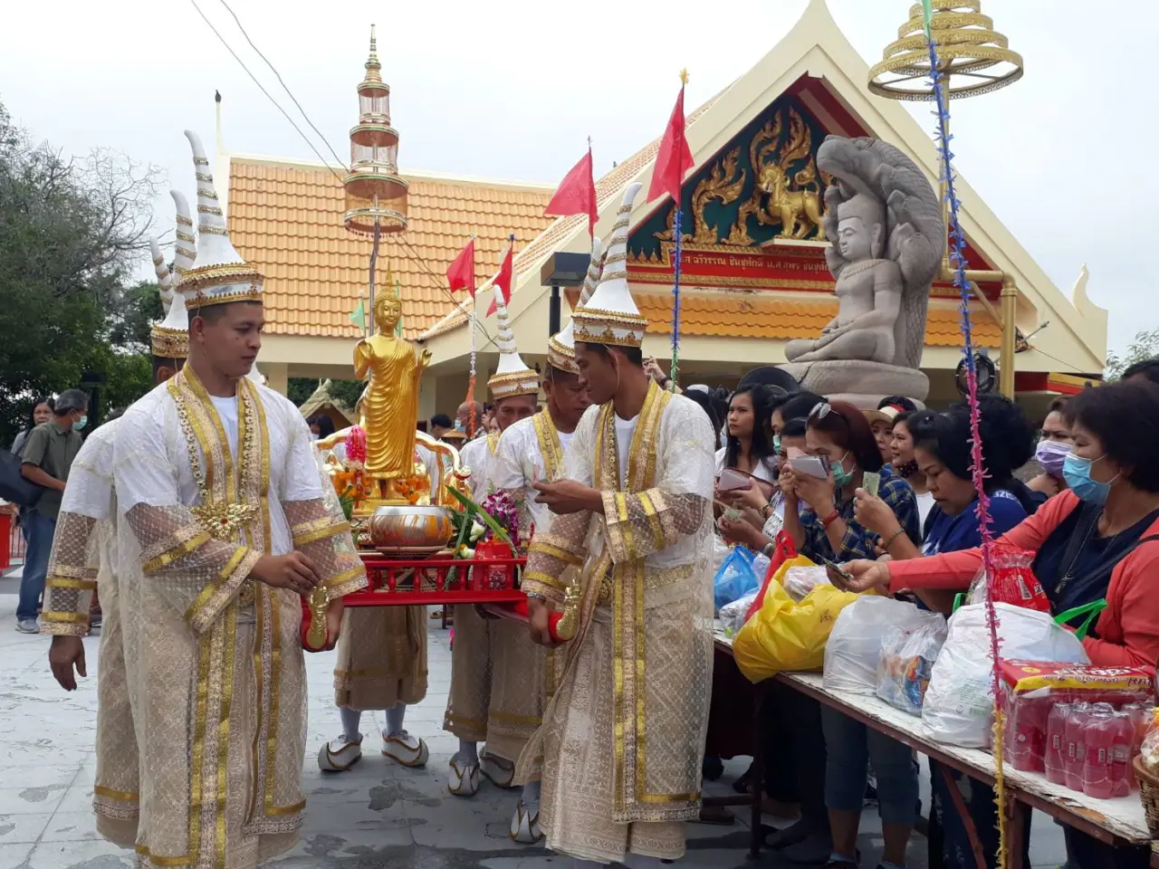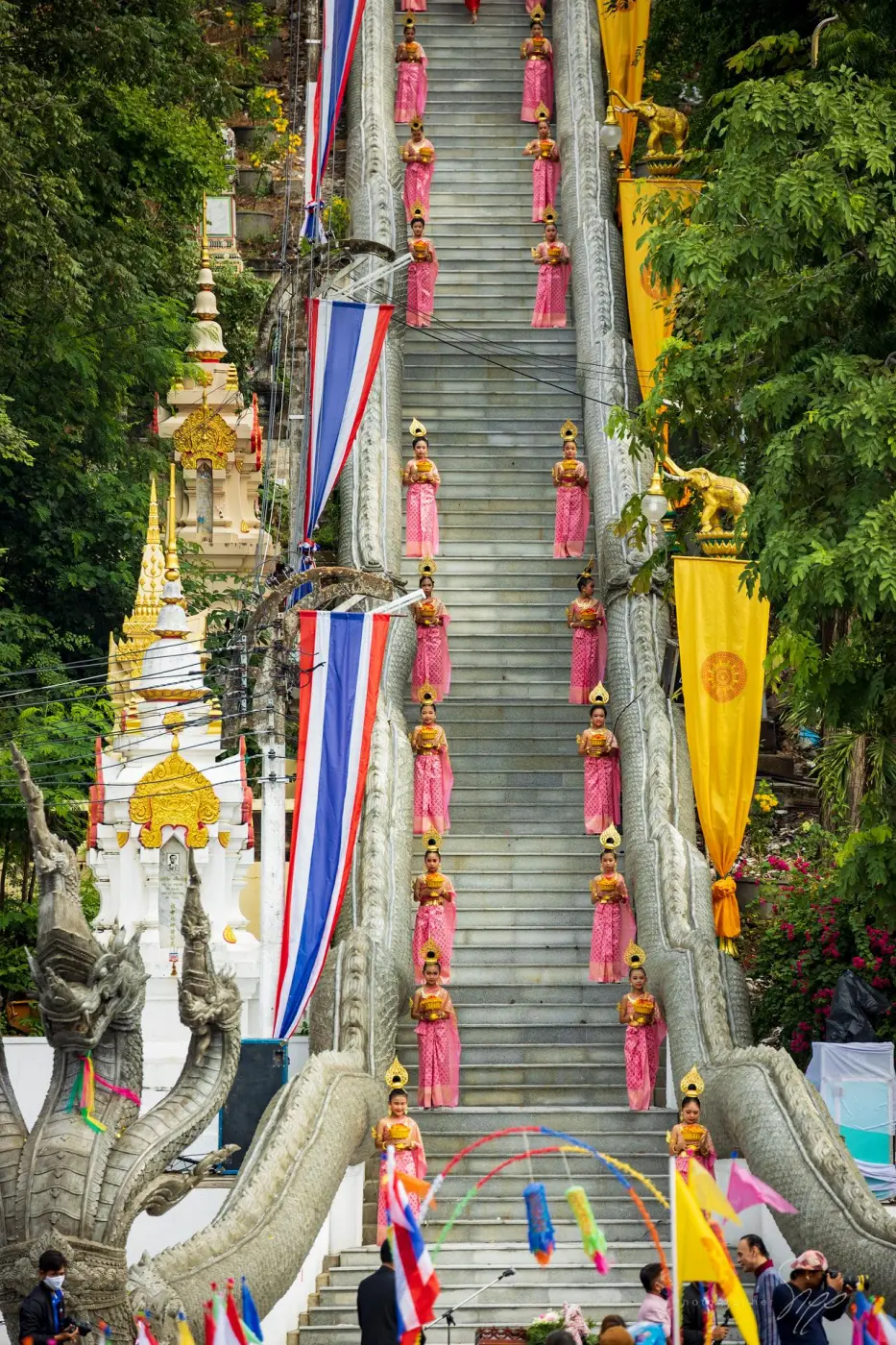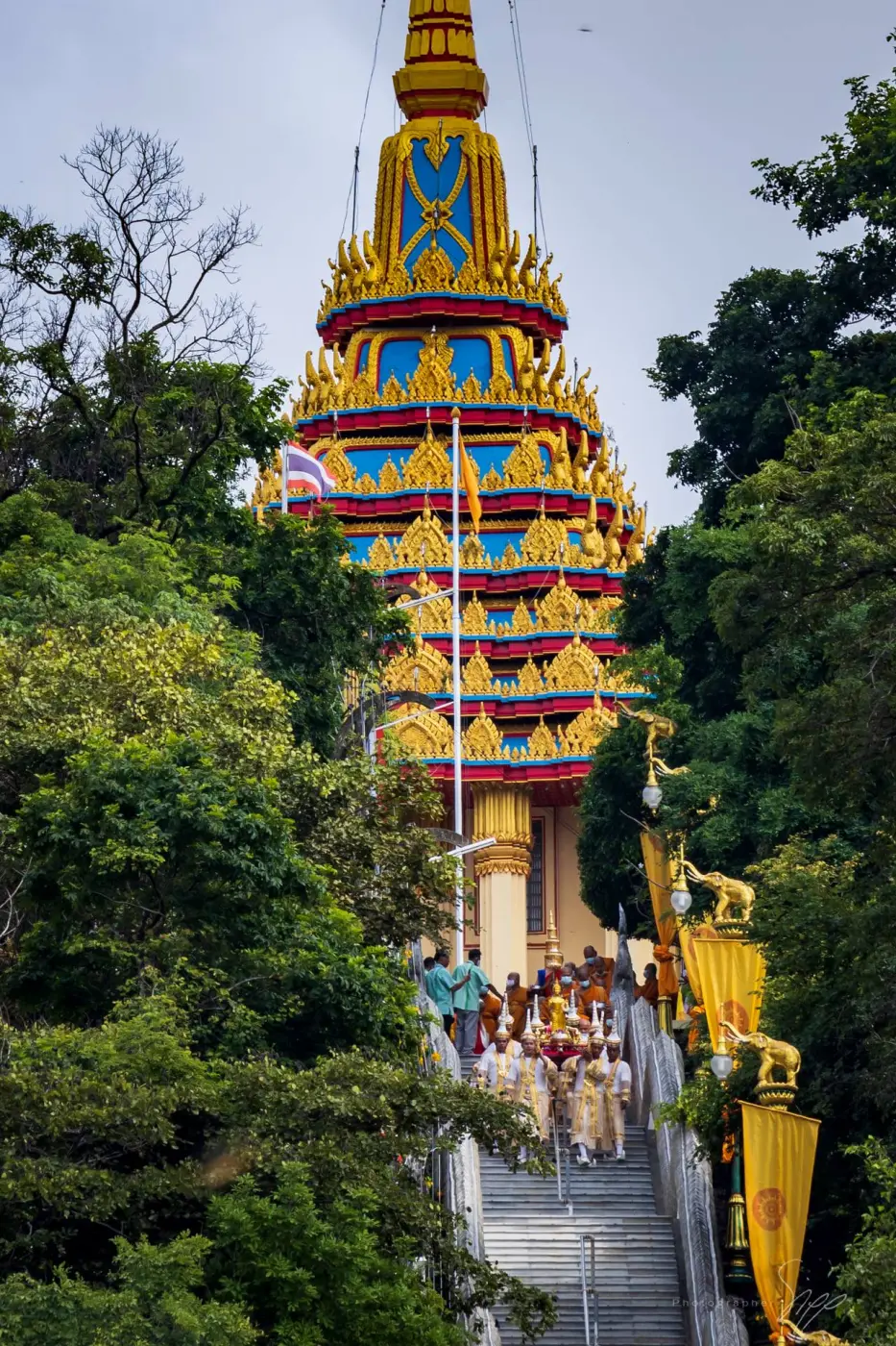 พระพุทธรูปถูกอัญเชิญลงจากมณฑปบนยอดเขาสะแกกรัง โดยมีขบวนเทวดาแต่งเต็มอลังการ แบกเกี้ยวลงมาตามบันไดพญานาคที่ทอดยาวลงมาจากยอดเขา ขนาบบันได 2 ข้างทางด้วยหญิงสาวในชุดไทยงดงาม เปรียบเสมือนนางฟ้าจากสวรรค์มาส่งเสด็จพระพุทธเจ้า ภาพตรงหน้ามันเหมือนพาย้อนเวลากลับไปยังวันที่พระพุทธองค์เสด็จลงจากดาวดึงส์จริงๆ เลยทุกคน