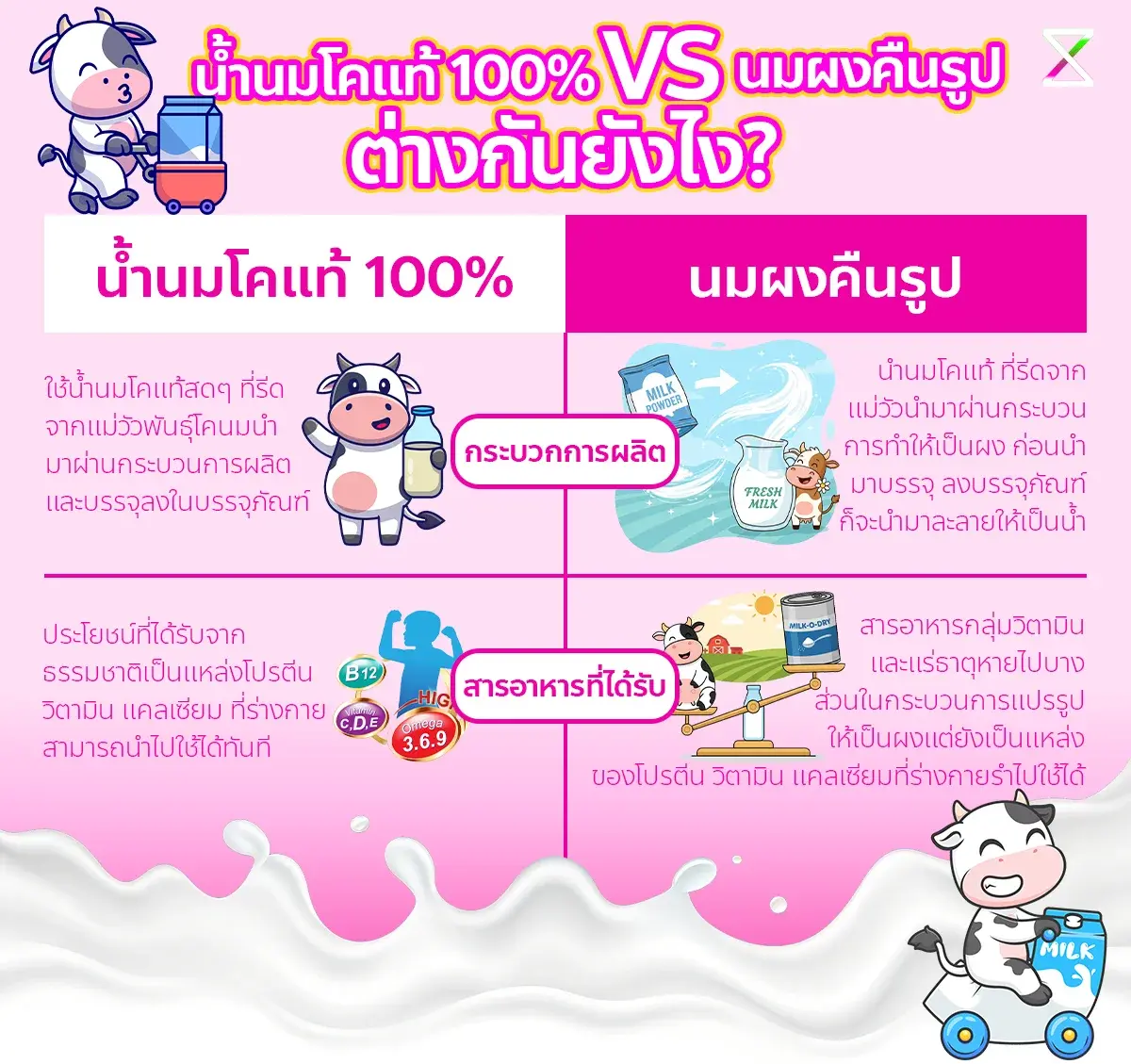 | องค์ประกอบหลัก | นมโคแท้ 100% (น้ำนมโค) | นมผงคืนรูป (Recombined Milk) |