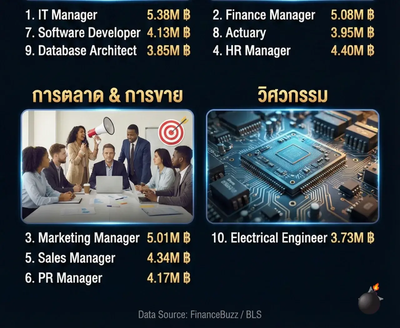 สื่อการเงินชื่อดังของสหรัฐฯ อย่าง FinanceBuzz ได้เปิดเผยรายงานโดยอ้างอิงข้อมูลจากสำนักงานสถิติแรงงานสหรัฐฯ (BLS) ซึ่งชี้เป้า "10 อาชีพมาแรง" ที่ตลาดแรงงาน (ในสหรัฐฯ) กำลังแย่งชิงตัวกันสุดๆ โอกาสเติบโตสูง และที่สำคัญคือ รายได้เฉลี่ยทะลุ 100,000 ดอลลาร์สหรัฐฯ ต่อปี หรือคิดเป็นเงินไทยคร่าวๆ คือ "มากกว่า 3 ล้านบาทต่อปี" ทุกตำแหน่ง!