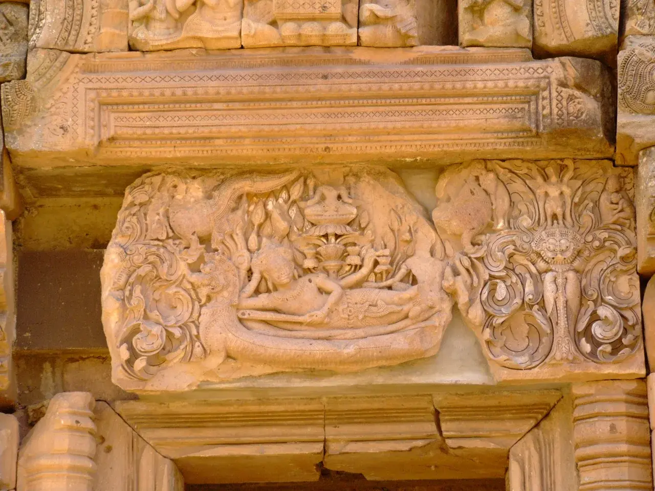 ในเอเชียตะวันออกเฉียงใต้ ทับหลังชิ้นนี้สลักจากหินทรายอย่างประณีต
