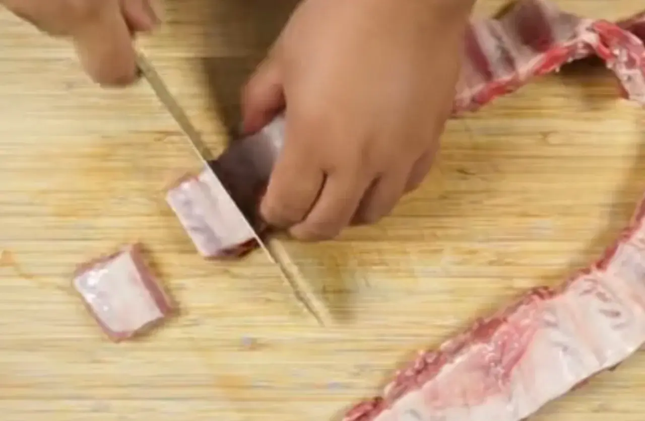 นำมาหั่นตามซี่กระดูก จะหั่นแบบซี่ต่อซี่ หรือ รวบ2ซี่ หั่นสักครั้งนึง ตามใจชอบขนาดชิ้นเนื้อ