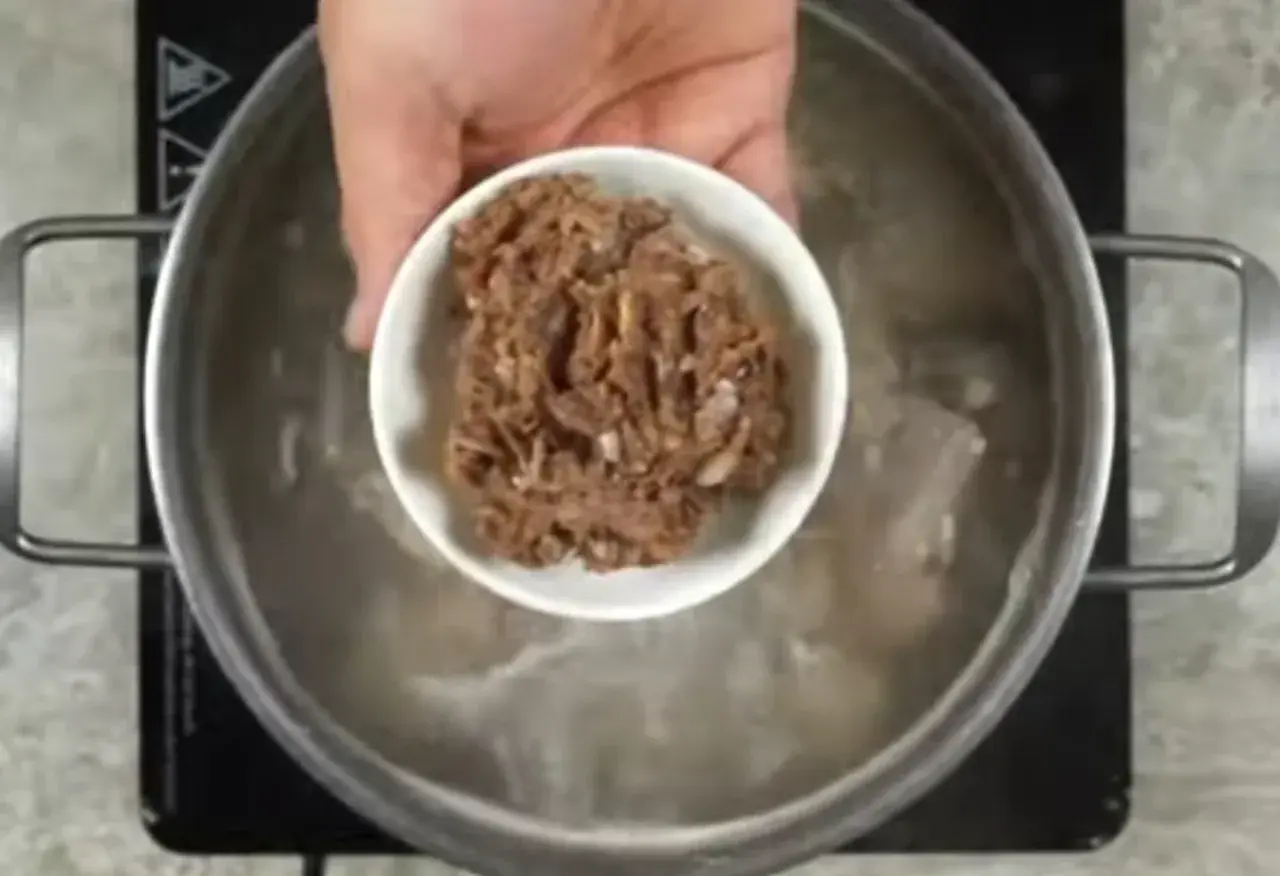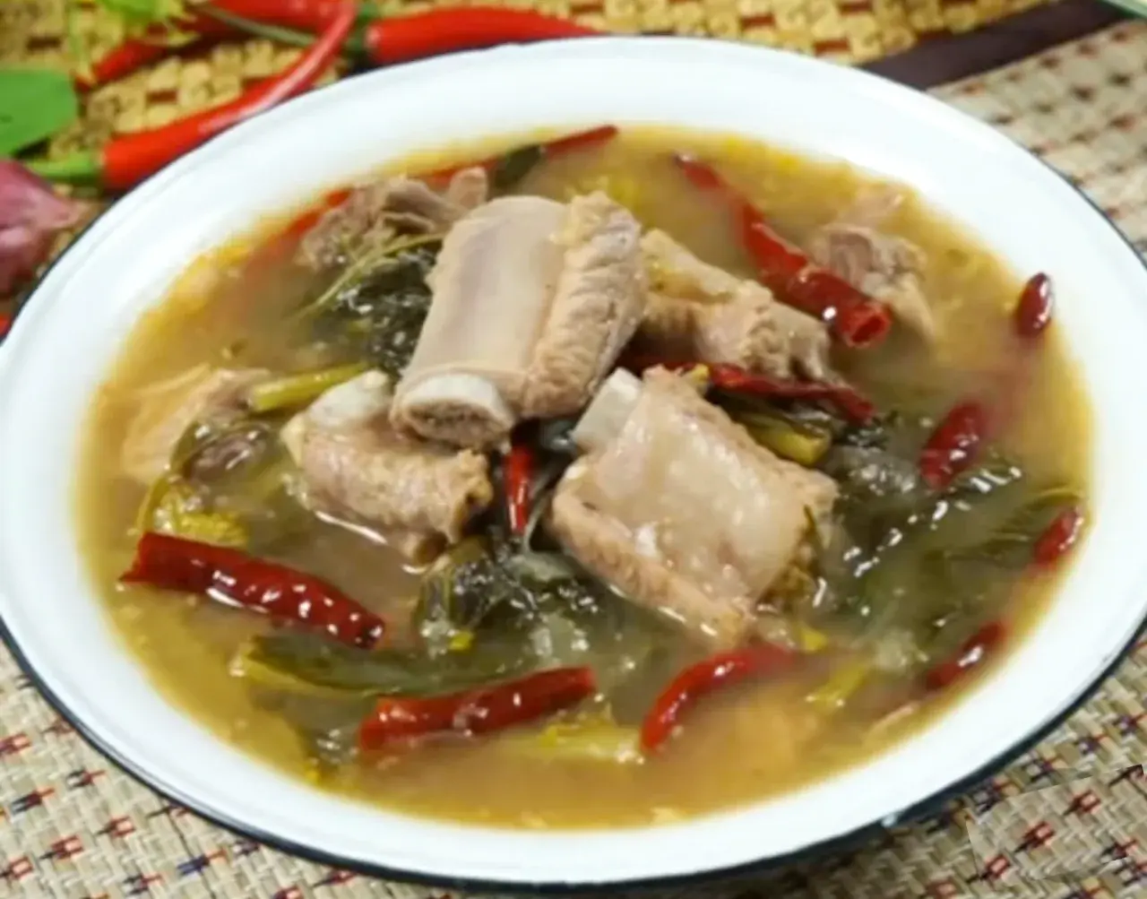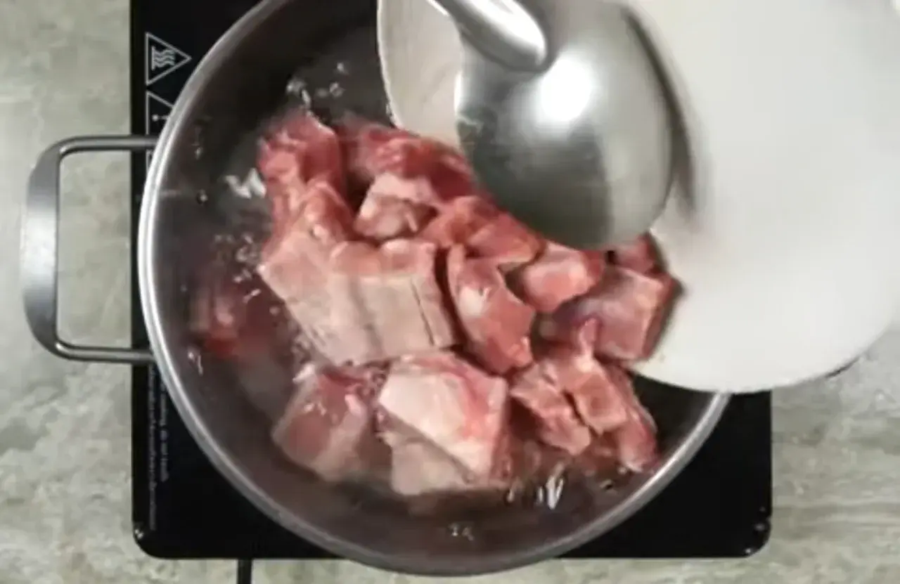 4. ตามด้วยซี่โครงหมูที่หั่นเตรียมไว้ ต้มรอจนเดือด ขั้นตอนนี้ห้ามคนเด็ดขาด ไม่ให้มีกลิ่นคาว