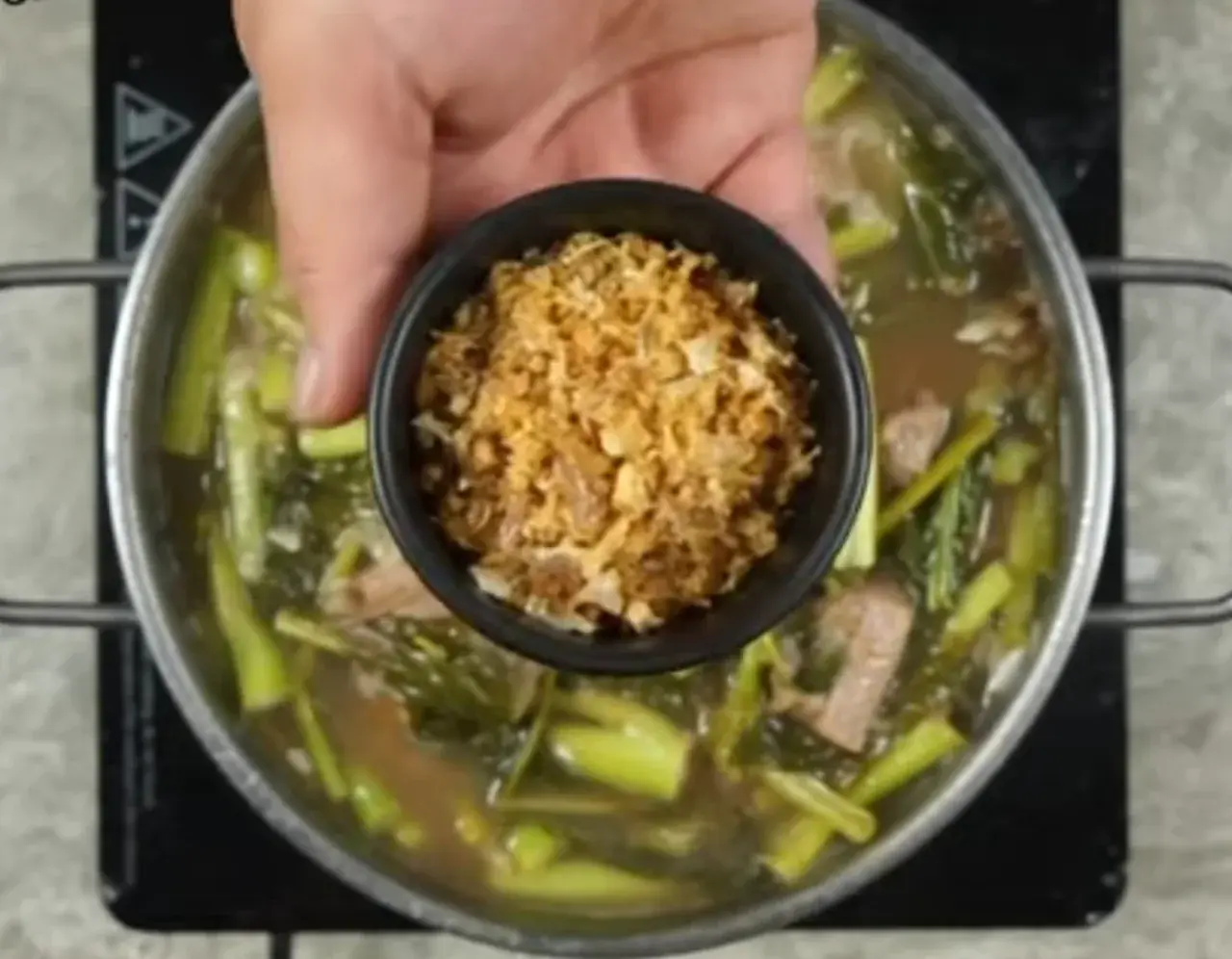 10. นำกระเทียมเจียวใส่ลงหม้อ เพิ่มกลิ่นหอม