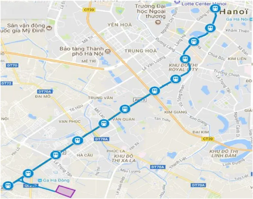 ประกอบด้วยสถานียกระดับทั้งหมด 12 สถานี เริ่มต้นจากเขตดงดา (Đống Đa)