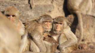 ฝูงลิงลพบุรีออกมานั่งและนอน เพื่อรับไออุ่นจากแสงแดดหน้าพระปรางค์สามยอด