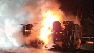 รถน้ำมันพลิกคว่ำ จ.เพชรบุรี ไฟคลอกคนขับสาหัส รถเสียหายทั้งคัน