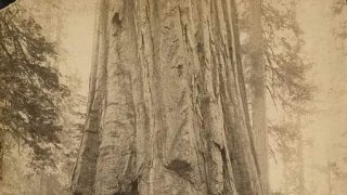 รถม้าลากผ่านส่วนที่ถูกตัดออกจากฐานของต้นซีคัวญ่าขนาดยักษ์ แคลิฟอร์เนีย เมื่อปี 1879