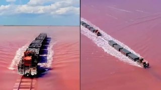 ทะเลสาบสีชมพูในไซบีเรียมีรถไฟวิ่งผ่าน