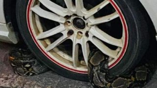 หนุ่มภูเก็ตนึกว่าโดนล็อคล้อ ก่อนก้มลงเห็นงูตัวเขื่องพันล้อรถแน่น งวดนี้มาแน่