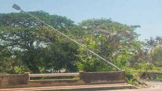 เสาไฟริมถนนติดคลองเอียงจนจะล้มตกน้ำ เดือนกว่าแล้วยังอยู่เหมือนเดิม