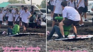 น่าชื่นชม นร.ชายไม่สนเปื้อน ลุยช่วยหญิงขาติดหล่มโคลน