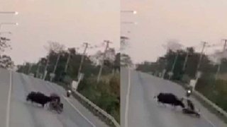 กระทิงพุ่งชนจยย. ลากเด็ก 7 ขวบเข้าป่า