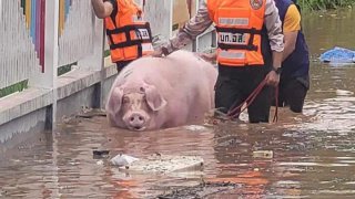 เศร้า ‘บำเรอ’ หมูแสนรู้ตายแล้ว กลืนน้ำท่วมมากไป จนป่วยหนัก