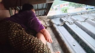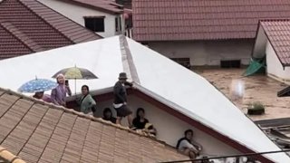 ครอบครัวติดอยู่บนหลังคา ขอความช่วยเหลือด่วนติดน้ำท่วม บ้านเริ่มทรุด