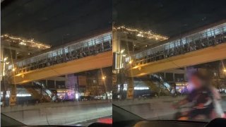 กลุ่มวัยรุ่นยืนต่อแถวบนสะพานลอย..ว่าแต่เขากำลังทำอะไรกัน!