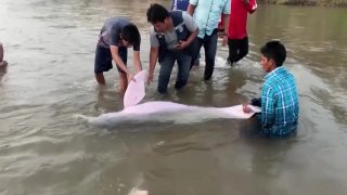 ชาวบ้านและเจ้าหน้าที่ ช่วยชีวิตโลมาสีชมพูเกยตื้น