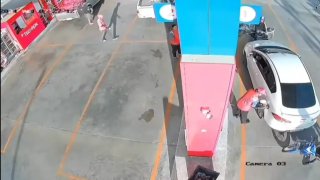 กล้องชัด!เก๋งเติมน้ำมัน ซิ่งชน จยย.กระชากสายน้ำมันหัวจ่ายขาด ทำปั้มน้ำมันเสียหาย