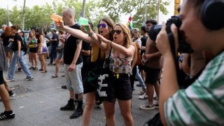 กลุ่มผู้ประท้วง ใช้ปืนฉีดน้ำ ไล่นักท่องเที่ยวกลับประเทศ เหตุเพราะนทท.ล้นเมือง