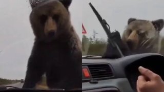หมีสีน้ำตาลปีนรถยนต์ที่เกาะซาคาลิน รัสเซีย ทำคนตกใจกลัว