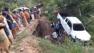 รถกระบะเสียหลัก ชนรถพ่วงข้าง ดึ่งลงห้วยลึก 3 เมตร หวิดดับ