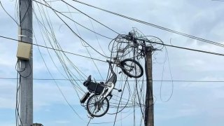 รถจักรยานไฟฟ้าขี่มาอยู่ดีๆ ขึ้นไปอยู่บนสายเสาไฟเฉย