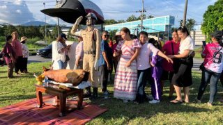 ไม่เชื่ออย่าลบหลู่! หญิงวัย 52 ปีบนรูปปั้น "จ่าเฉย" หลังเคยมาบนแล้วลูกชายสอบติดตำรวจ และถูกล็อตเตอรี่หลายใบ