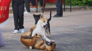 1 ภาพ ร้อยเรื่องราว! ชาวเน็ตเอ็นดู "น้องหมาสวบกัน" แย่งซีนคนถือป้ายขบวนพาเหรด
