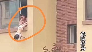 พ่อจับลูกห้อยหัวนอกหน้าต่างหลังฉี่ในบ้าน