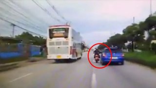 ใครผิด? เมื่อเก๋งสวิฟท์ชนกับมอไซค์ จนเกือบโดนล้อรถทัวร์ทับ