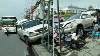 รถเมล์ ชนกับรถยนต์ แล้วรถยนต์ เสียหลักปีนขึ้นฟุตบาทชนจักรยานที่จอดอยู่หลายคัน