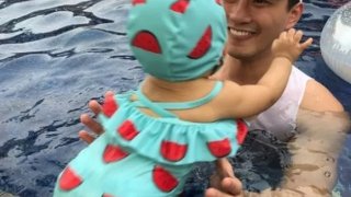 (คลิป) น้องเป่าเปา ในชุดว่ายน้ำแตงโม จะทำได้มั้ย! เมื่อ พ่อบี้ บอกให้โดดจากขอบสระ