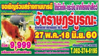 ขอเชิญร่วมทำบุญไถ่ชีวิตโค-กระบือประจำปี2560ครั้งที่5มอบแก่เกษตรกรจ.สกลนครวัดราษฏร์บูรณะวันที่27พ.ค.-18มิ.ย.60